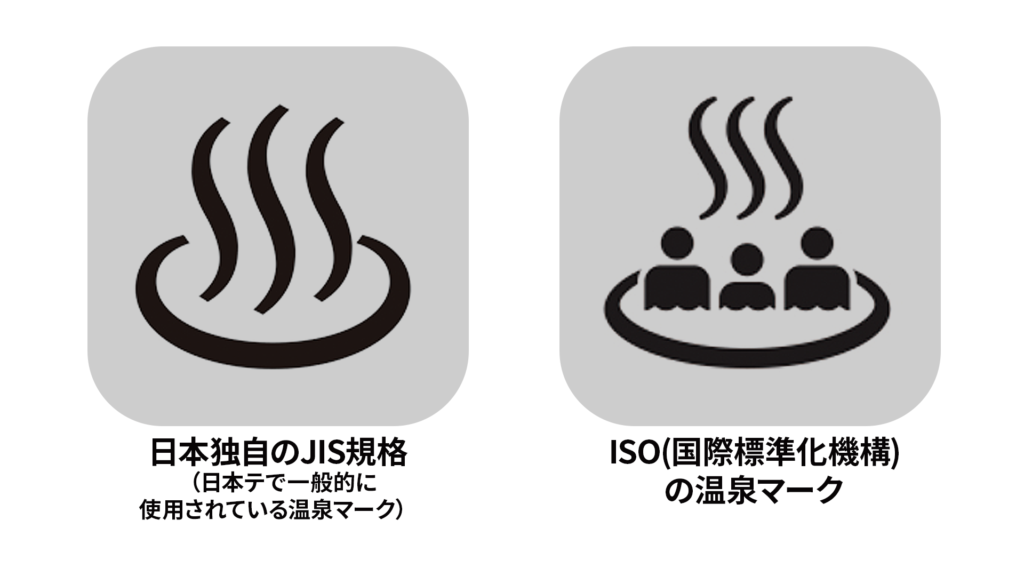 従来の温泉マークはJIS(国内規格)となっているため、外国人からは「温かい料理」や「レストラン」に見えるという意見があり、東京オリンピックに向けてISOの温泉マークへの変更が検討されました。しかし、温泉マーク変更についてのアンケート調査では、日本人と外国人で意見が分かれる結果となりました。経済産業省の調査によると、日本人の63%がJISの温泉マークが分かりやすいと回答。外国人の71%はISOの温泉マークが分かりやすいと回答しています。現在では、古くから使用されている温泉マークも残しつつ、状況に応じてISOの温泉マークを使用する新旧選択制がとられるようになりました。
