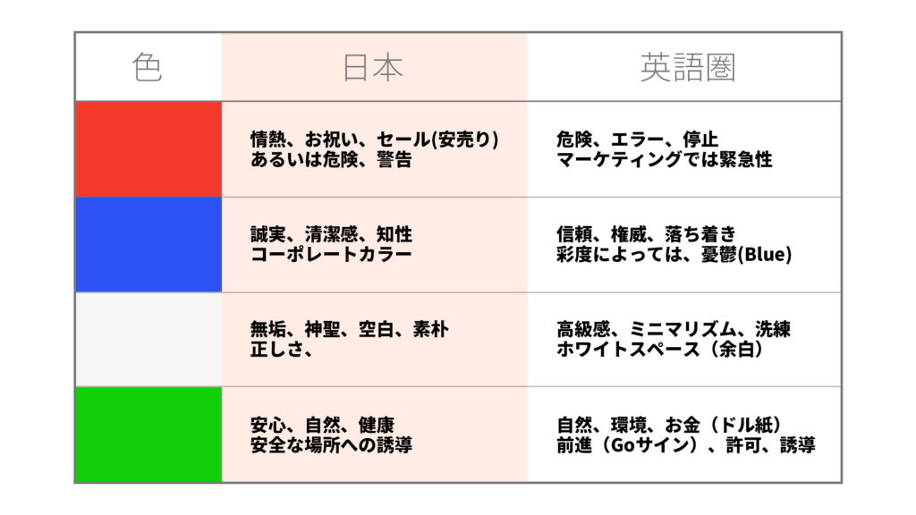色は言語の壁を越えて直感的なメッセージを伝えますが、その解釈は文化圏によって、共通点もありますが強調されるニュアンスの重みが異なる場合もあります。日本と、英語圏での色のイメージの違いをまとめてみました。