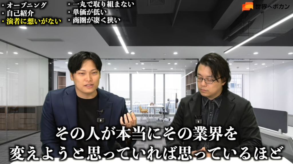 良い意味でも悪い意味でもというのがめちゃくちゃ大事で、この社長は別にこの事業に興味ないなとか、この業界を変える思いが一切ないなというのがどうしても伝わっちゃうんです。