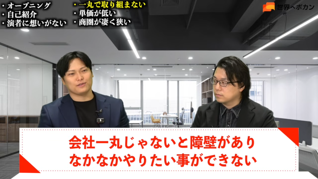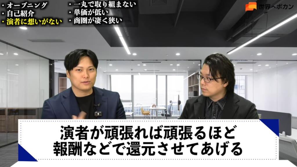 まず体制面の話なんですけど、1つ目は演者に思いがない企業。
