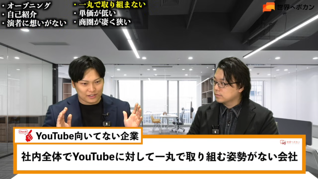 社内全体でYouTubeに対して一丸で取り組む姿勢がない会社。これは1つ目にもつながってくるんですけれども、いわゆる1つの事業部だけがYouTubeを頑張って、他の事業部に「出てよ」とか「こういう企画やるんだから協力して」といったときに「俺関係ないから」みたいな感じで他の事業部の理解が得られない。