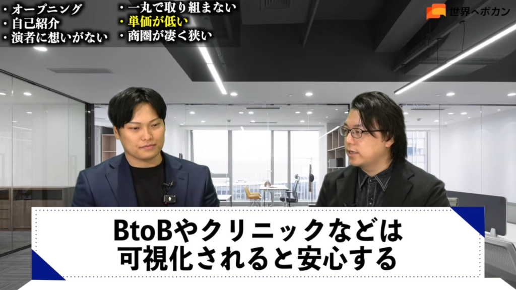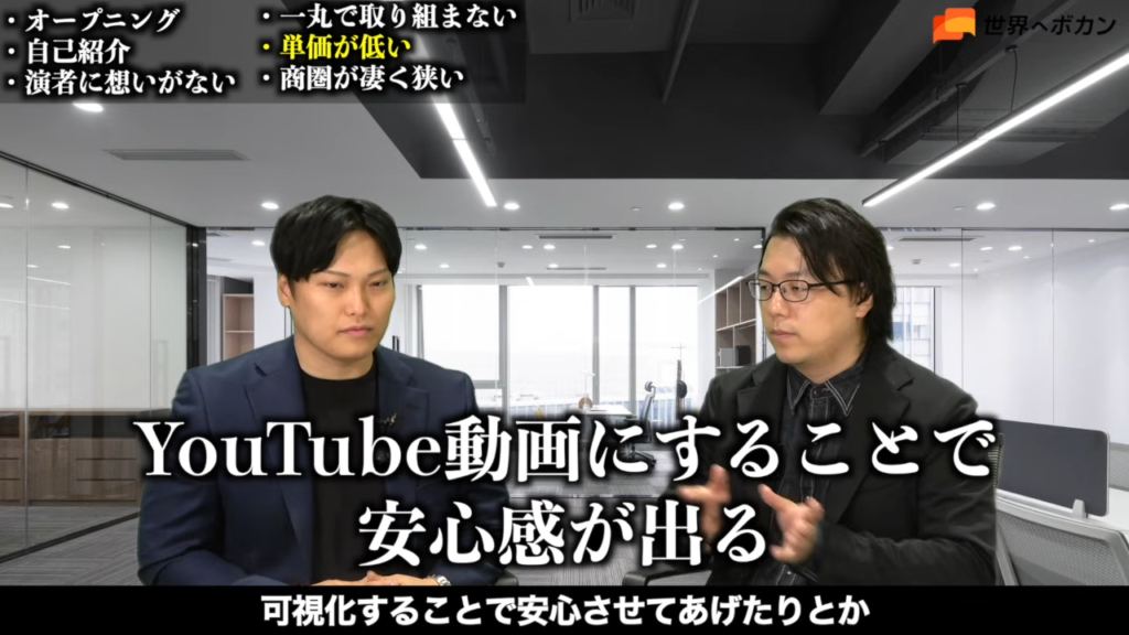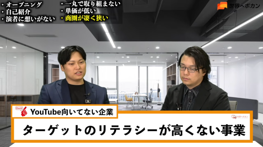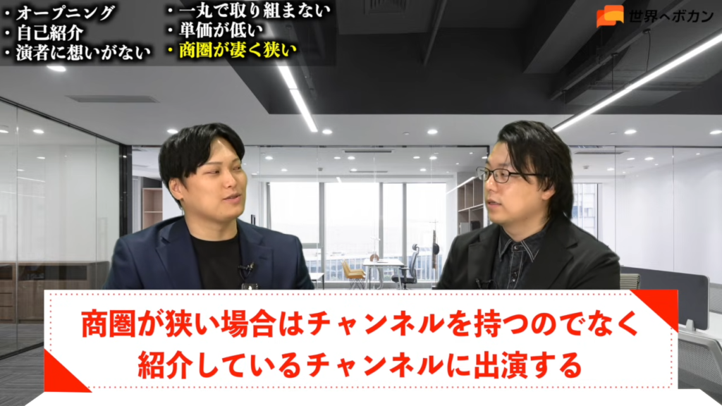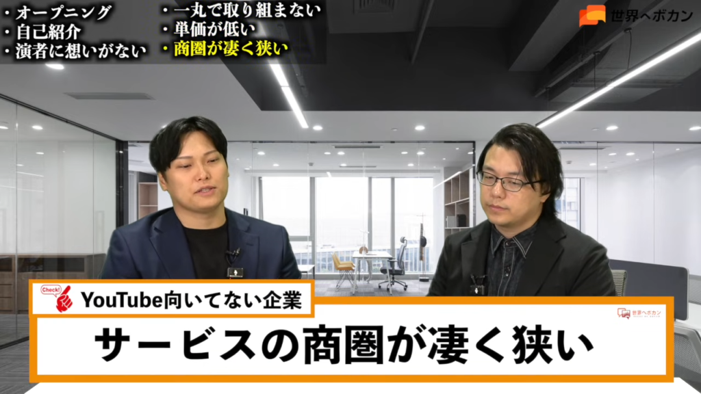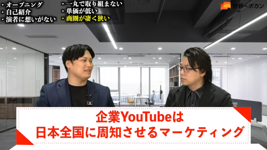 というのも結局YouTubeって全体マーケというか、要は日本全国に周知させるマーケティング方法なんですね。なので商圏がたとえばですけど、本当に高円寺のこの一角でしか基本はお客様を見込んでいない飲食店とか、お土産屋みたいなところはあんまり効果が薄いという感じです。