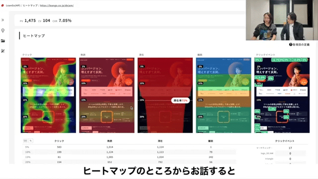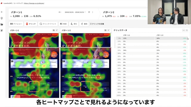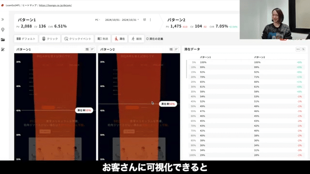 ちゃんと率で見れるので、結局どこがどうなったのかみたいなのを各ヒートマップごとで見れるようになっています。こういうところの細かいこだわりは、弊社ならではと思っているのがヒートマップですね。