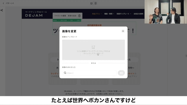 こんな感じでタグを入れていただけたら、たとえばツールもコンサルも破格というところを破格ですみたいな感じで変えるのも、これだけノーコードでできますよというのもありますし、画像の追加みたいなのもローカルの環境からアップロードすることもできまして。たとえば世界へボカンさんですけど、こんな感じでできたりとか、もちろんここのサイズ変更みたいなのはノーコードでできますよと。