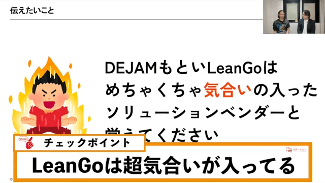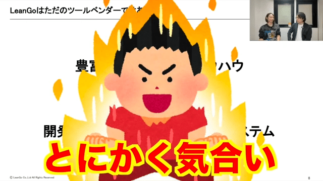 気合いの会社なんですね。LeanGoはわりとゆるふわな会社かと思ったら、気合いの会社なんですね。