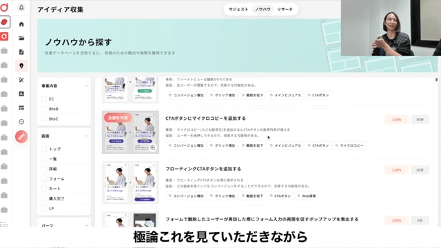ABテストとか勝ちパターンとかをデータベース化しているので、極論これを見ていただきながら、ABテストをやっていただくというのもありますし、サジェストという機能。
