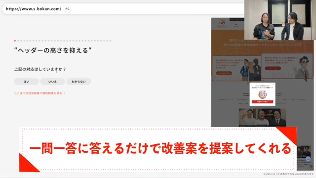 あとはこういうふうに一問一答でできている、できていない。みたいなのを回答していくだけで改善案を手に入れるというのができるおもしろ機能を作っています。