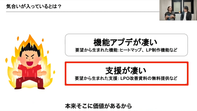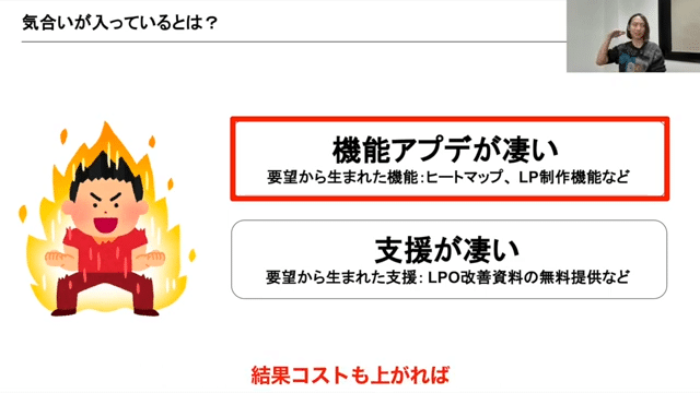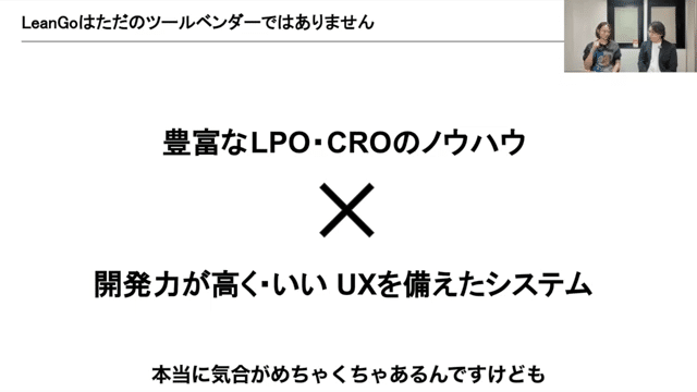 豊富なLPOノウハウ CROノウハウ×開発力が高くUXを備えたシステムというところで、どんどん支援をしていって、本当に気合がめちゃくちゃあるんですけども。