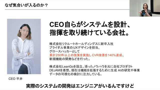 実際のシステムの開発はエンジニアがいるんですけど、要件定義だったりとかワイヤフレームの作成、DEJAMというプロダクトの開発ロードマップは、僕が決めているんです。社長がここまでコミットするツールベンダーってないじゃないですか。
