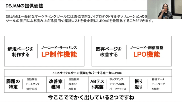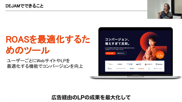 DEJAM。一言で言うとROASを最適化するようなツールになっています。広告経由のLPの成果を最大化して、CPAを下げてROASを最適化しましょうみたいな感じですね。