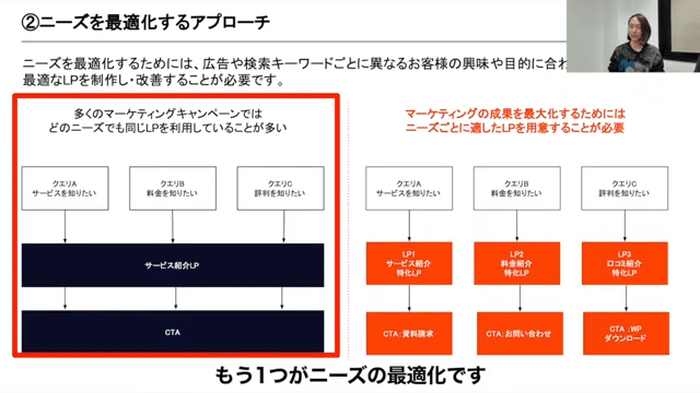 広告訴求ごとにLPを変えたら「それは無理だよね」って。「運用できないよね」という話ですね。