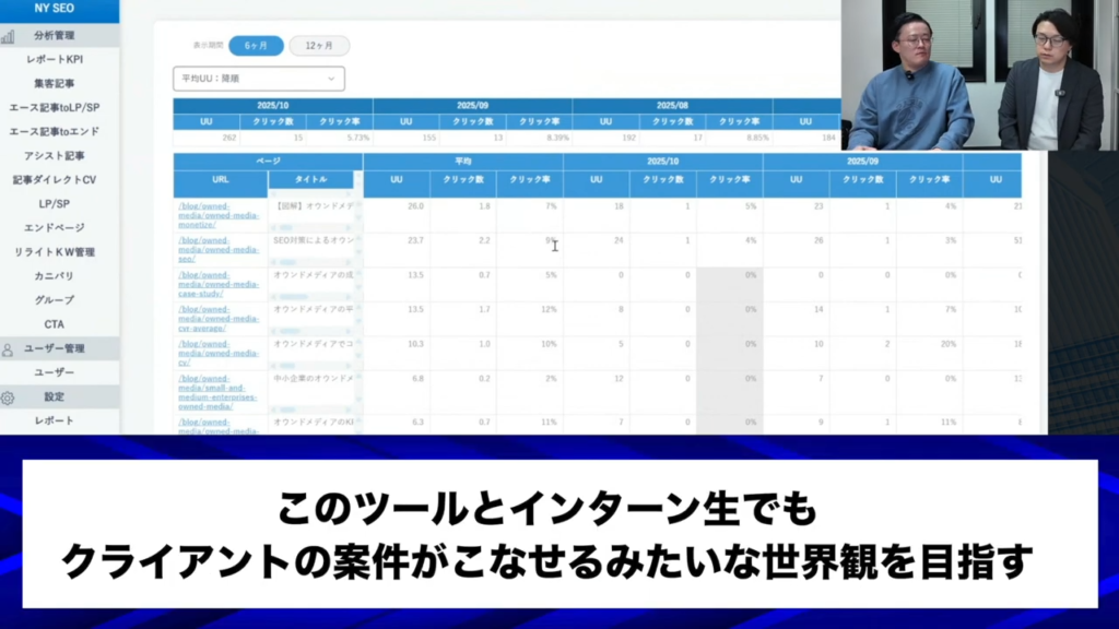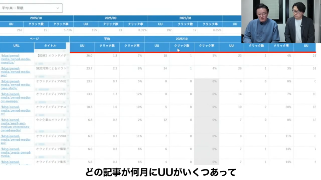 月ごと、全体平均、月のサマリーみたいな感じで見れるので、さっき言っていただいたこの記事はUUが多いけど、コンバージョンはないよねみたいなことが可視化できるんですよね。現状はこれを人が見て、ある程度並べ替えができるので、今言ったコンバージョンが多い記事はもっとここまで増やす。リライトするとか、ない記事は増やす。