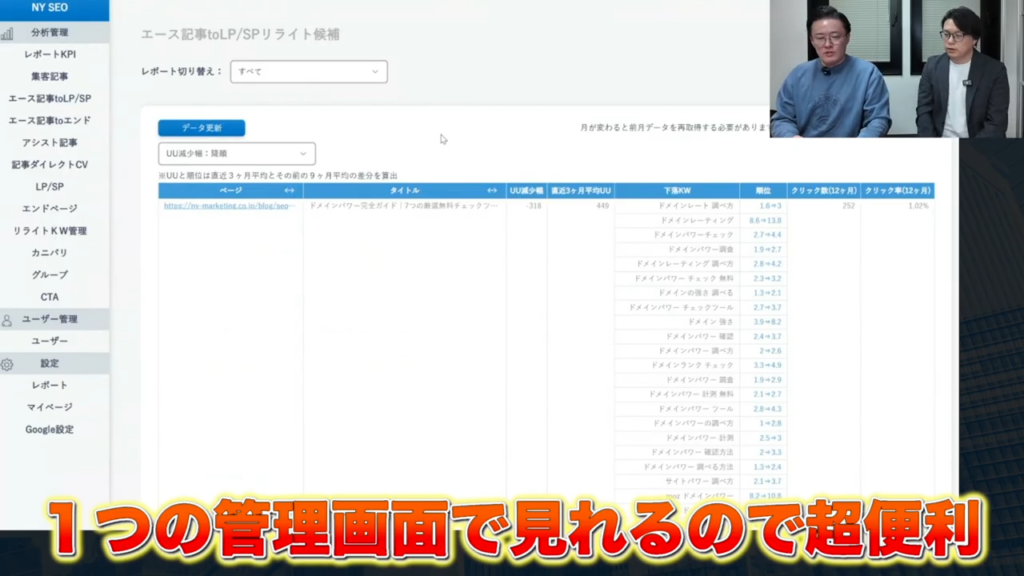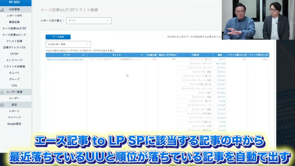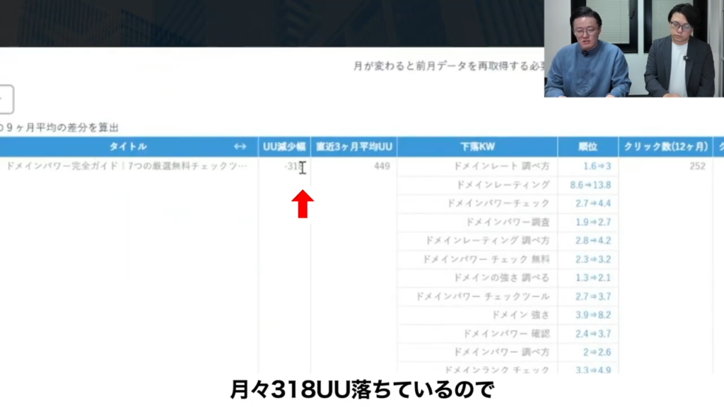 2種類ありまして、1つ目が画面を出しているんですけど、エース記事 to LP SPに該当する記事の中から、最近落ちているUUと順位が落ちている記事を自動で出しています。これはちょっと長いんですけど、1個目がうちのドメインパワーの記事で、直近の3か月で見ると月々318UU落ちているので。