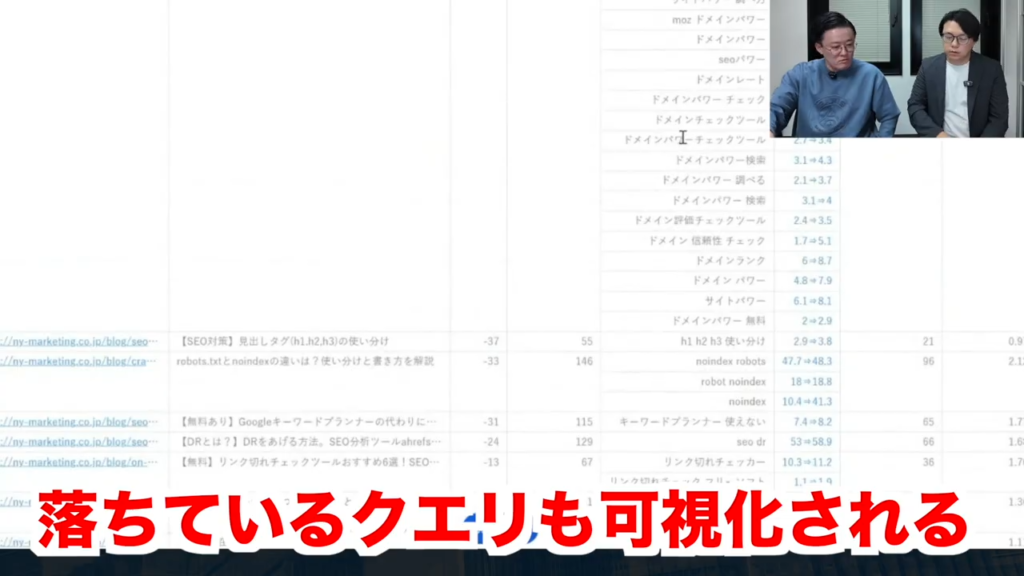 1つのページの中で複数のクエリが上がっていたとして、このクエリは4位以内に入っているから合格だけど、白になっているものに関してはリライトする余地があるよねというところで……1つ目の軸としては下落幅。もう1つのところに関しては1つの記事の中でのまだ伸びしろがあるところというのをピックアップしてくれるみたいな?