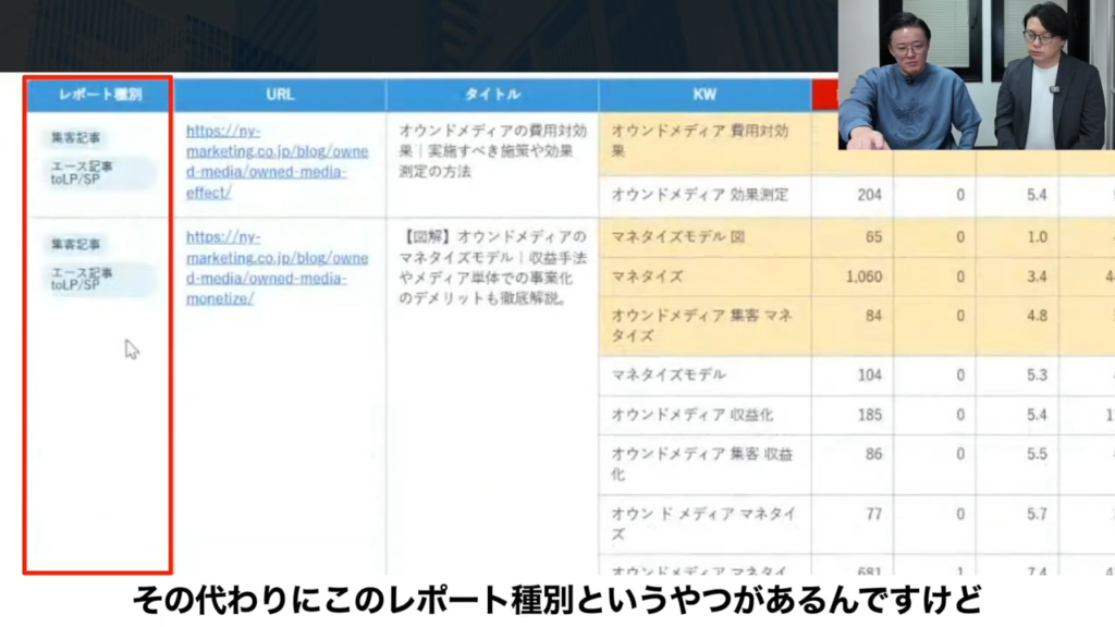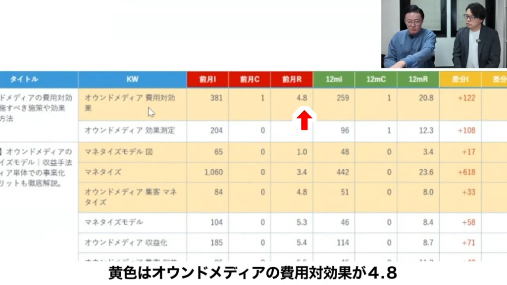 たとえばこの記事であれば、黄色背景は順位が高いもの。白がリライト候補なんですよね。うちの基準としては、4位以上だったらOKみたいな設定をしているので、黄色、オウンドメディアの費用対効果は4.8だけどオウンドメディアって効果測定が5.4だから、この効果測定も上げたいからリライトしようみたいな。