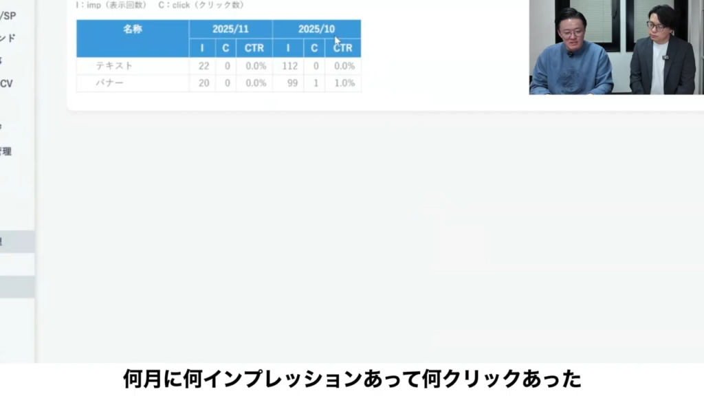 実際に見てみると、まず記事ごとのどの記事が何月にUUがいくつあって、そのうちLPに何人移動したかみたいなクリック数、率。