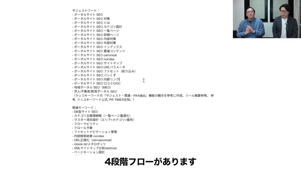 実際に進める上でも、サジェストしてきてくれたキーワードだったり、質問だったりとかを見て、自分たちが出したいアウトプットに合わせて加筆したり削除したりとかができると。それによってH2だったりアウトラインができてきて、概要も上がってきて、それに合わせて作成するから自分たちのエッセンスが含まれたチューニングされた記事になってくると。