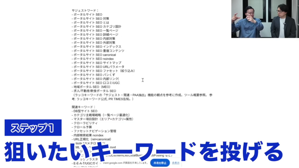 1回キーワードを投げて一気に出すんじゃなくて、まず第1段階として、狙いたいキーワードを投げます。