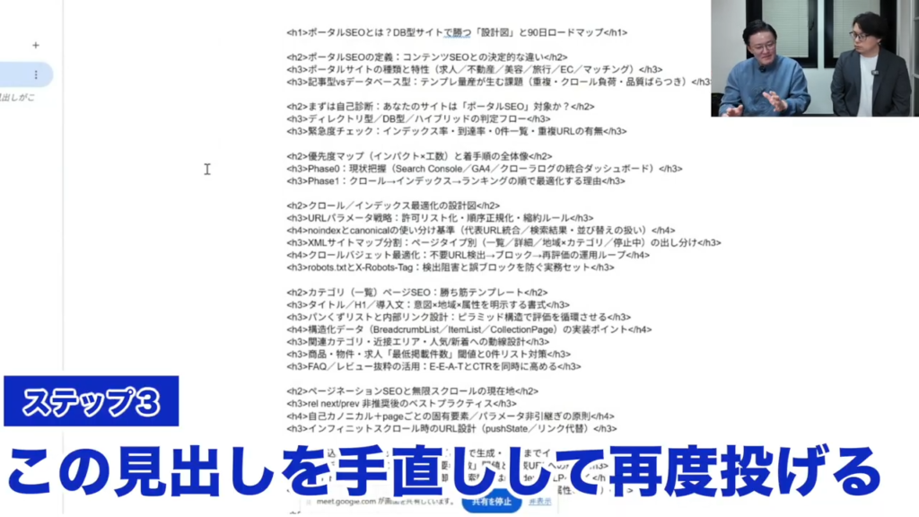 そうすると返ってくるものがこちらの見出しが返ってきます。先ほどの情報を元に、もともとの学習エンジンとGPTが見出しH1からH4のものを作ってくれます。