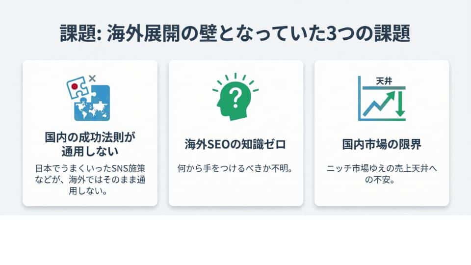 - 海外展開への意欲はあったが、ターゲット国選定・SEO・英語発信など何から始めるべきか整理できていなかった。ニッチ市場ゆえに、市場拡大の方向性を描けずにいた。