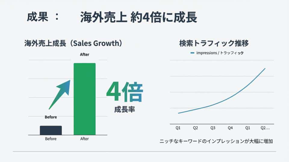 - 海外売上が約4倍に増加。検索流入が約3倍増加。ニッチ領域でもSEOとコンテンツ積み上げで市場拡大が可能と実証。